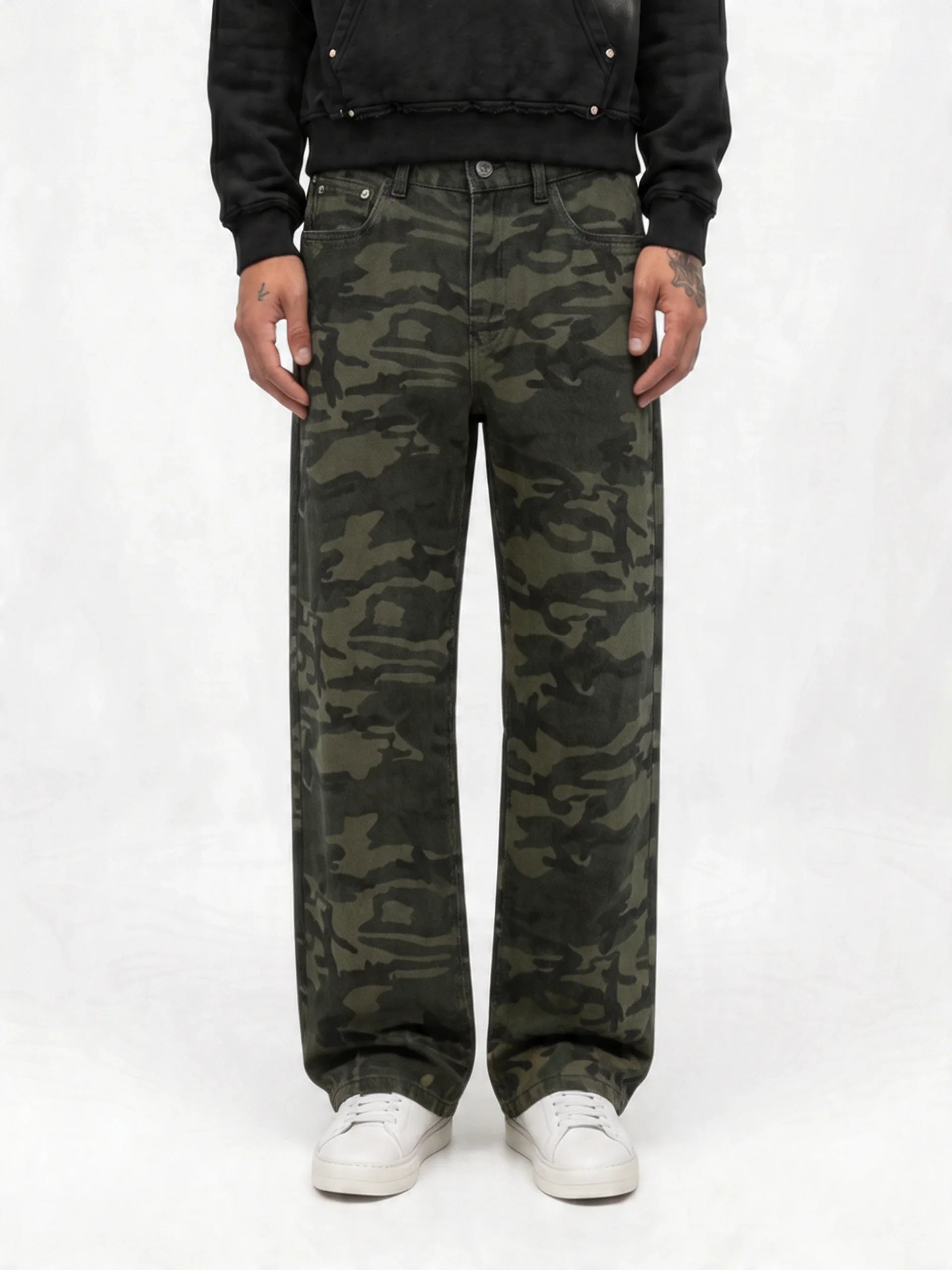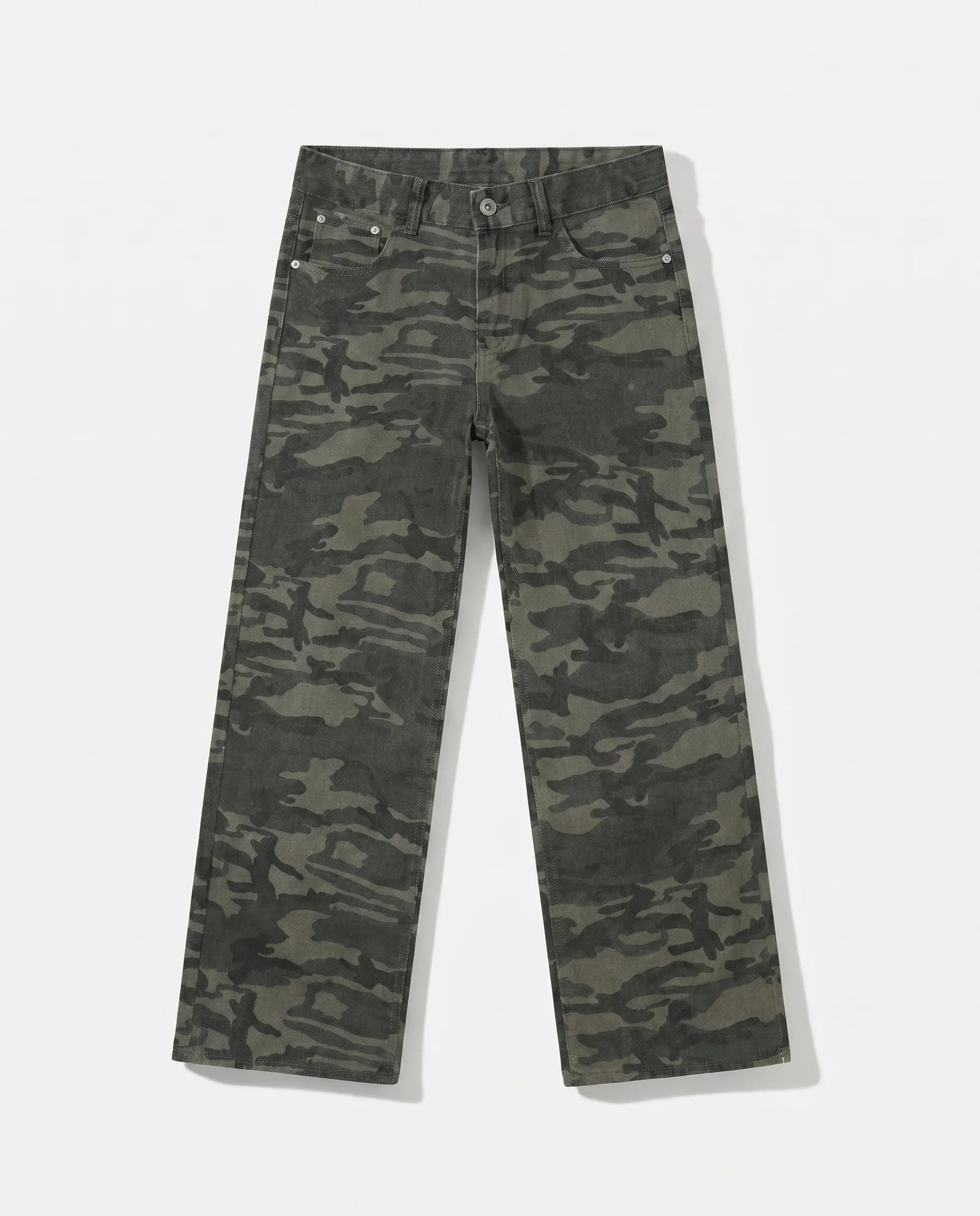 Meet the Army Pant. A heavyweight straight-leg jean in a classic military camo print — clean construction, washed finish, built for everyday wear.